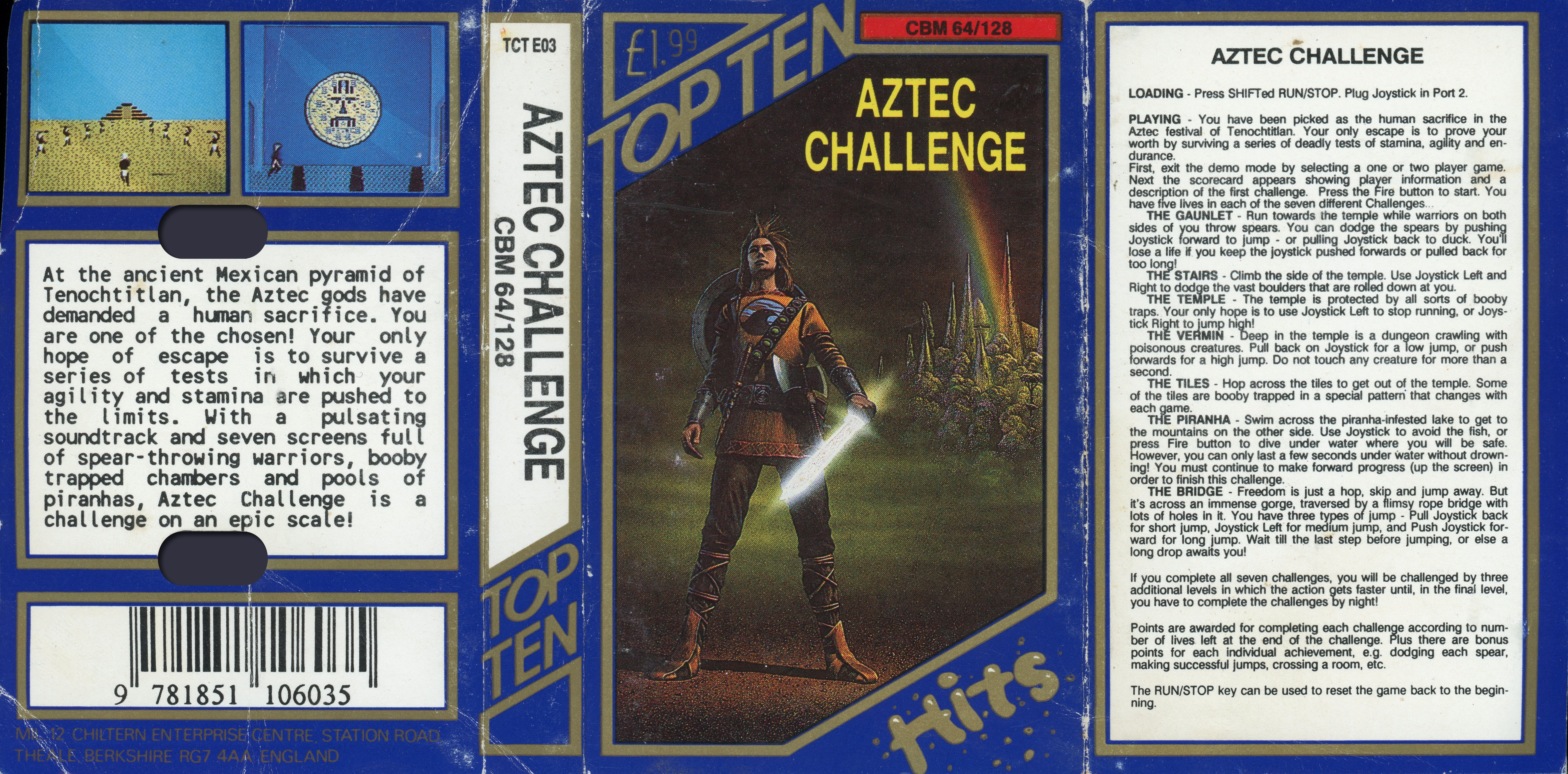 At the ancient Mexican pyramid of Tenochtitlan, the Aztec gods have demanded a human sacrifice. You are one of the chosen! Your only hope of escape is to survive a series of tests in which your agility and stamina are pushed to the limits. With a pulsating soundtrack and seven screens full of spear-throwing warriors, booby-trapped chambers and pools of piranhas, Aztec Challenge is a challenge on an epic scale!